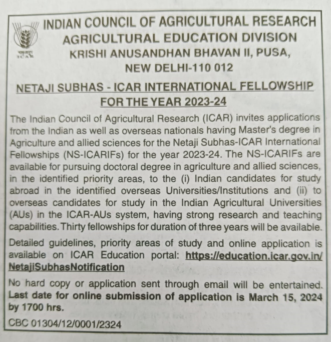 - ICAR invites Applications for the Indian as well as overseas national having Master's Degree in Agriculture and allied Sciences for the Netaji Subhas- ICAR international Fellowship