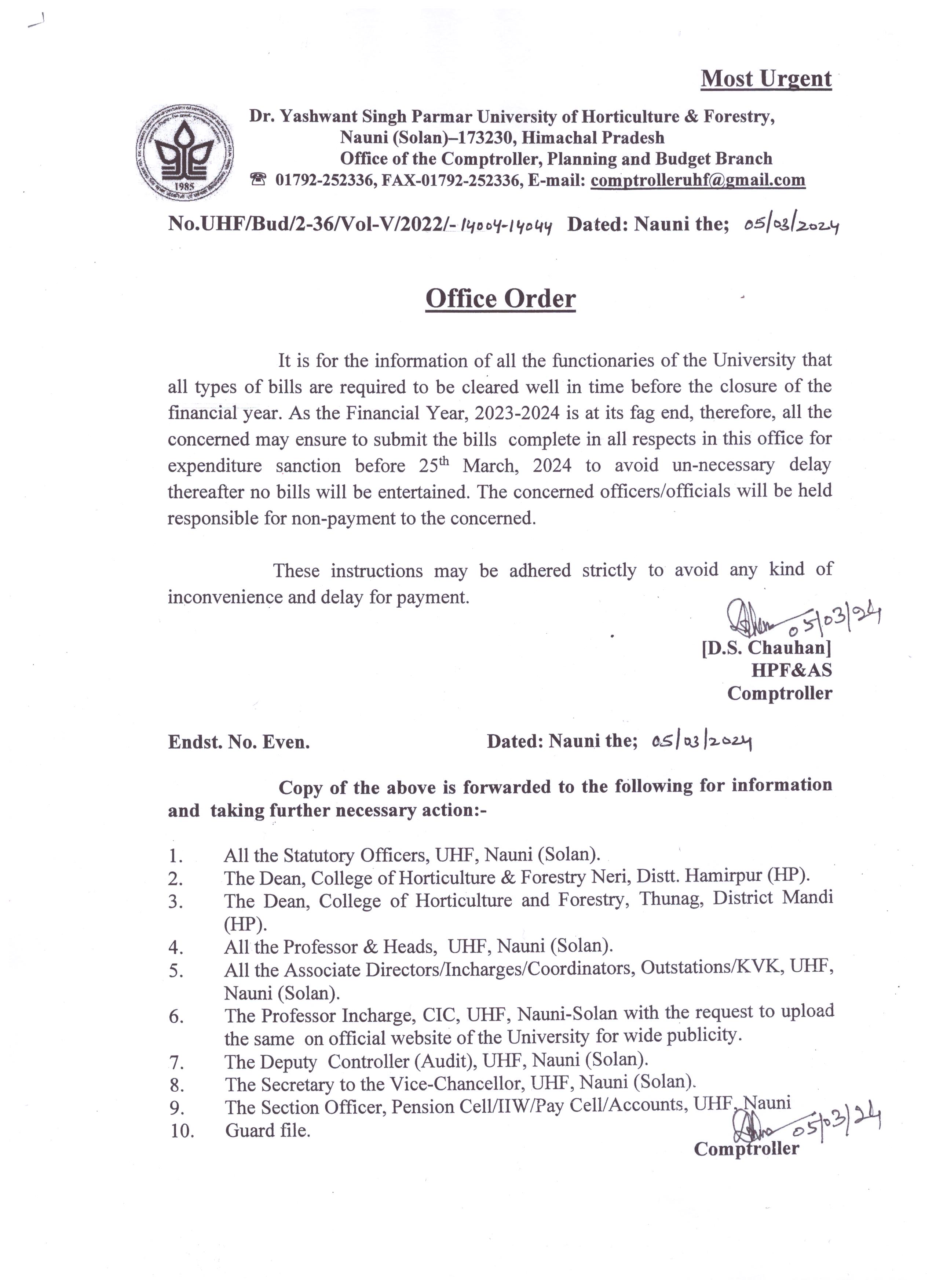 - Office order dated 05.03.2024 regarding clearance of bills.