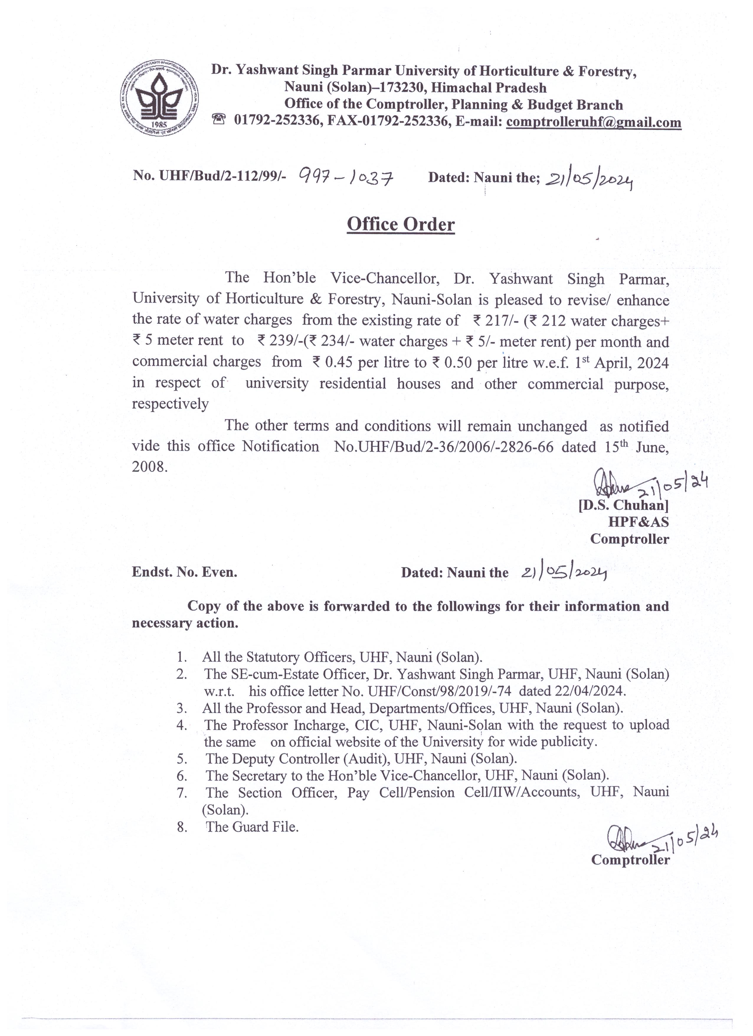 - Office order dated 21.05.2024 regarding revised rate of water charges.