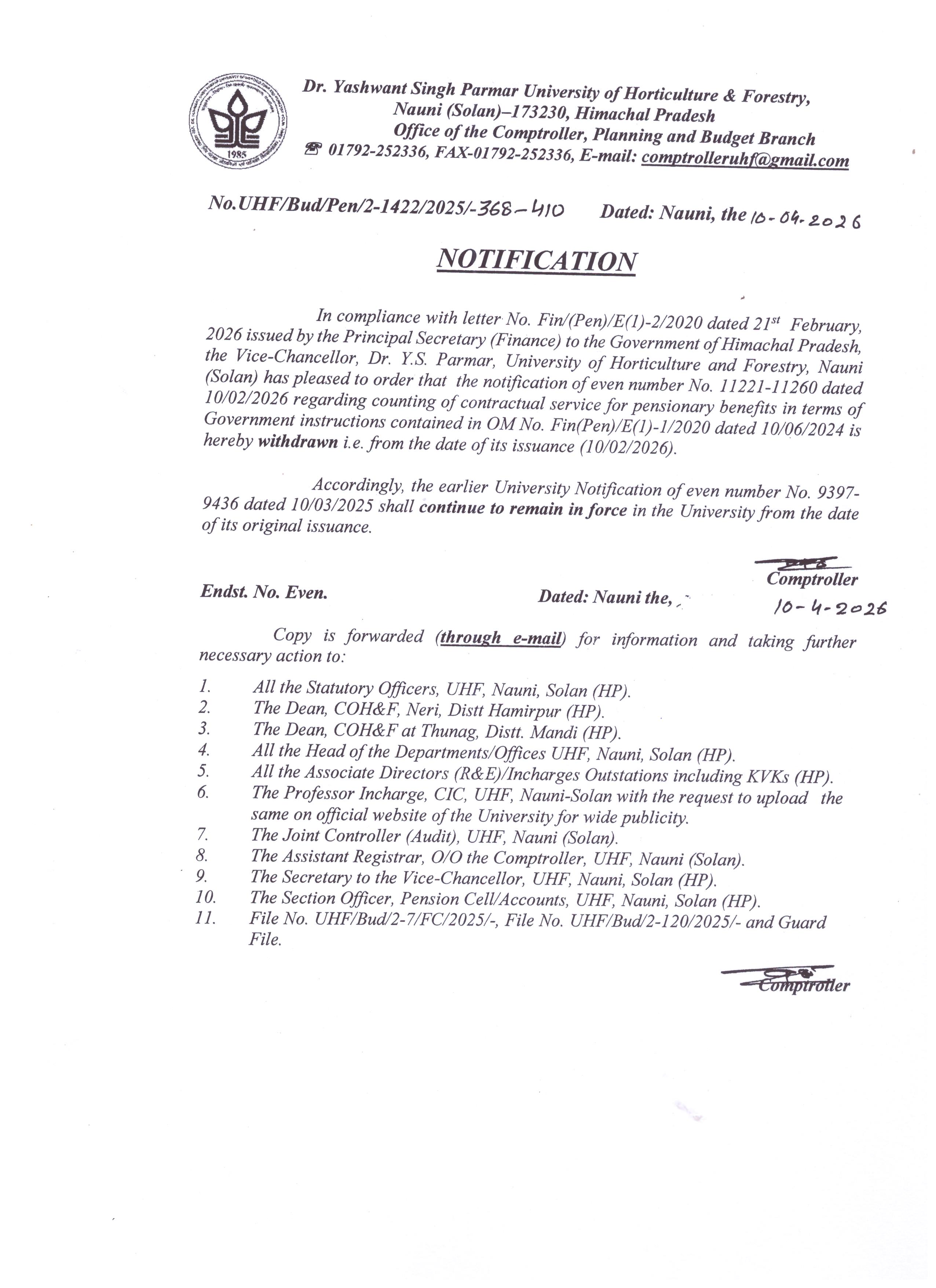 - Notification dated 10/04/2026 regarding counting of contractual service for pensionary benefits -->