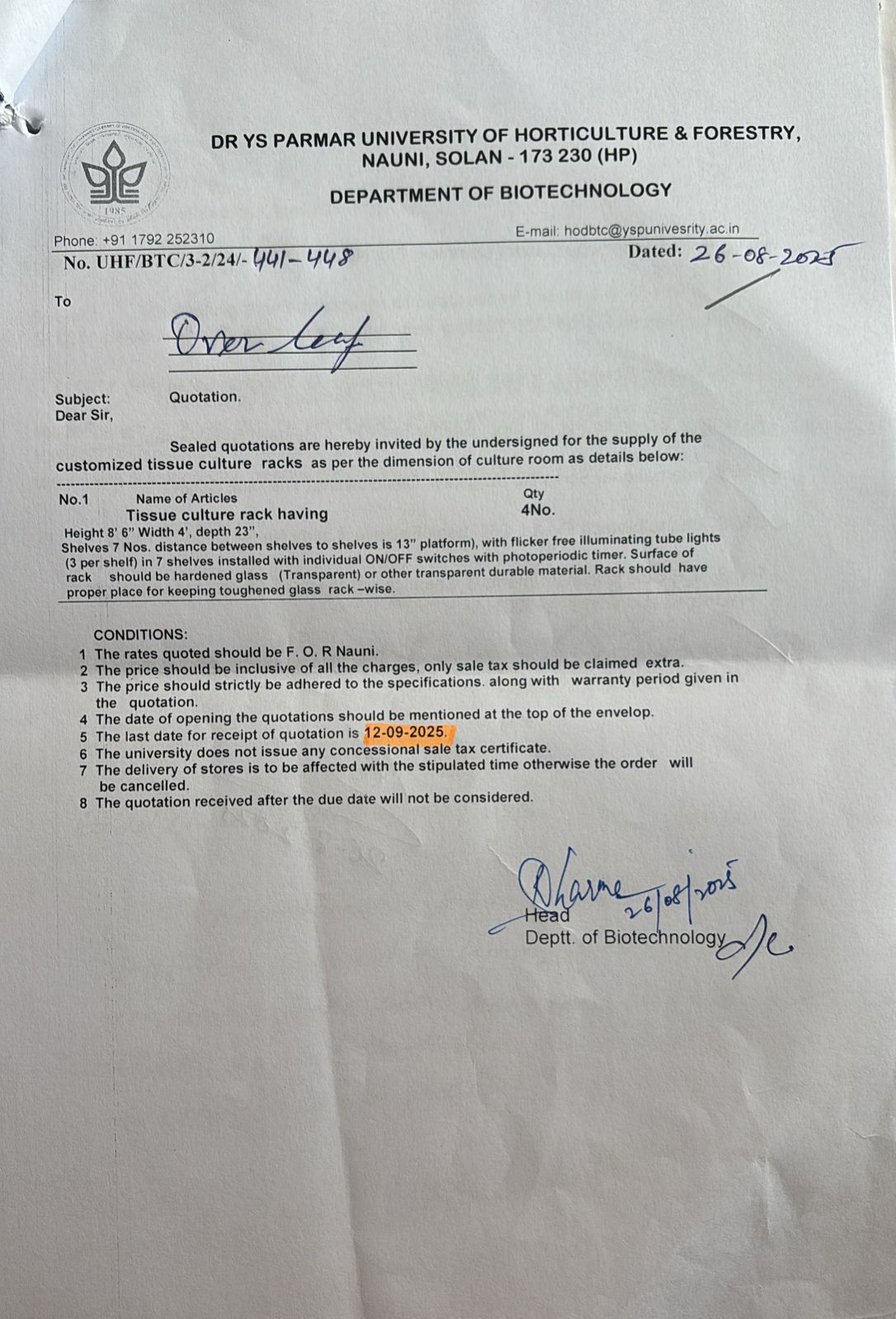 Sealed Quotations are invited for the supply of customized tissue culture racks.
